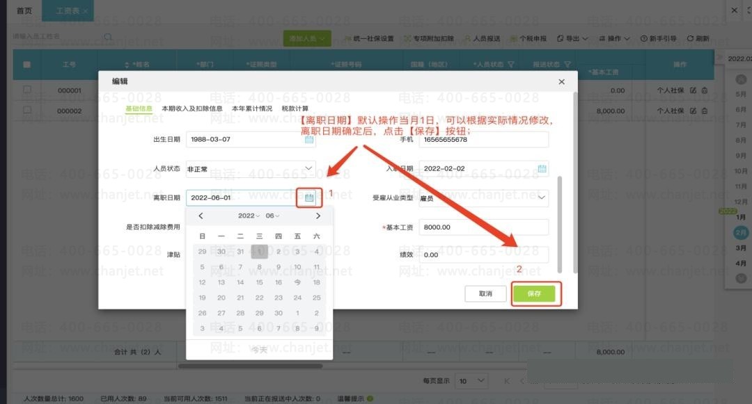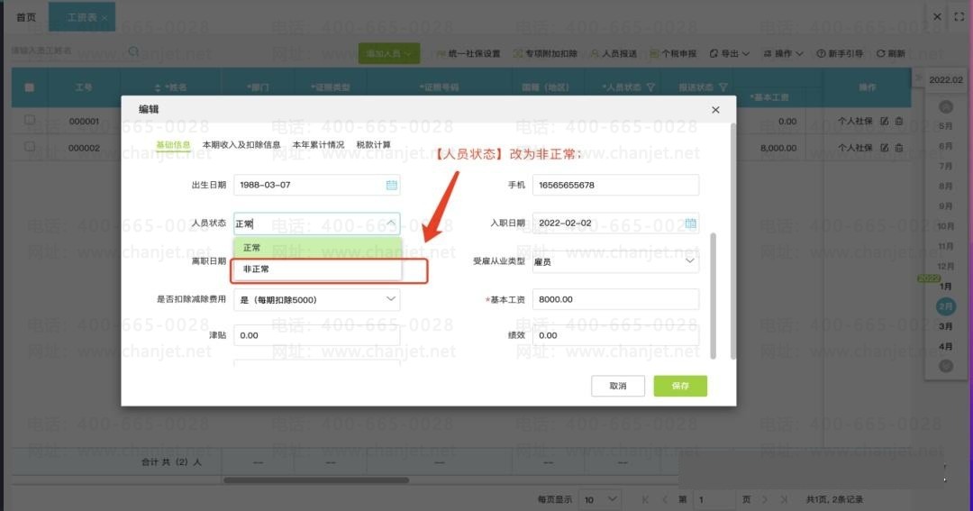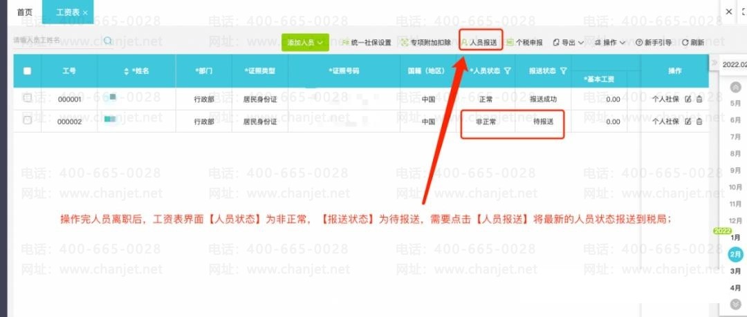 2.人员离职删除操作流程:若需删除离职人员,请先将该人员状态调整为“非正常”,完成人员报送后,即可删除。