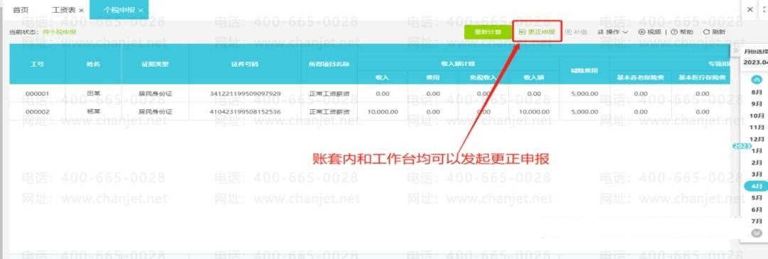 申报成功且已过征期或缴款成功后,“申报”按钮将变为“更正”。修改工资数据后,重新进行税款计算,即可点击“更正”提交修改。