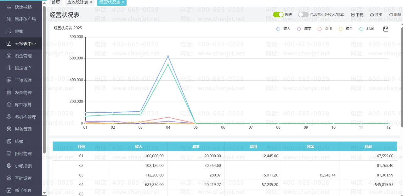 经营状况表功能支持一键生成可视化图表(收入/成本/费用/利润趋势)