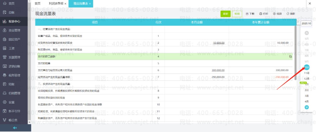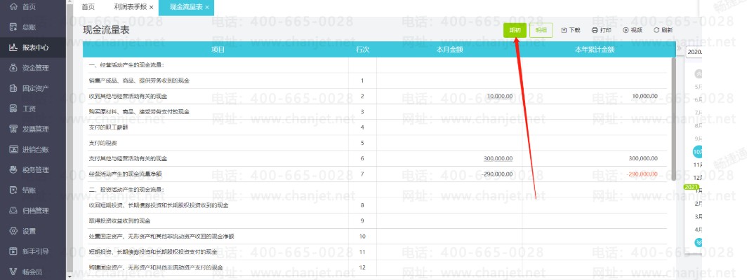1.进入软件界面,点击按钮【报表】-【现金流量表】进入现金流量表界面,如图所示: