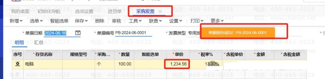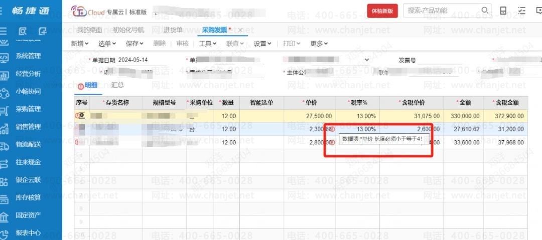 进货单生成采购发票的时候,发票保存失败,报错提示:单价 长度必须小于等于4。