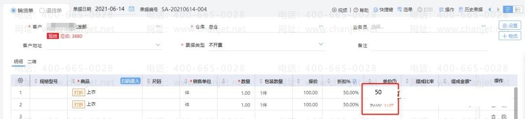 2、在促销期间选择该商品录入数量为2或录两行存货,系统会自动将商品的单价变为5折的价格,将在单价旁标【打折】;