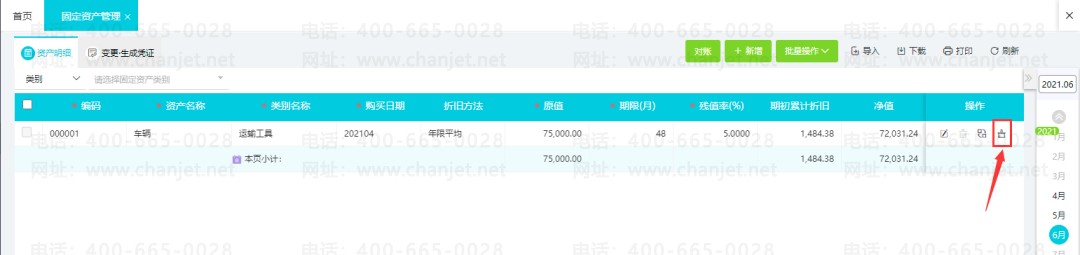 无论本月是否已经折旧,都可以进行清理工作,在清理的当月,进入【固定资产】-【固定资产管理】-【资产明细】,清理相应的固定资产。