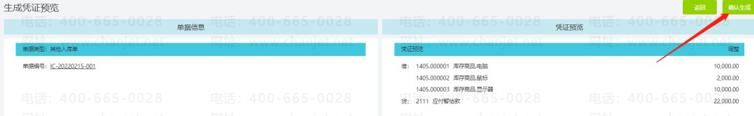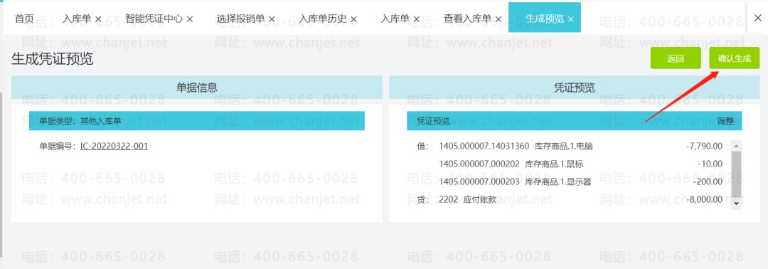 回冲后将发票取如【发票管理】模块,发票将自动生成入库单。再通过业务单据生成凭证即可。