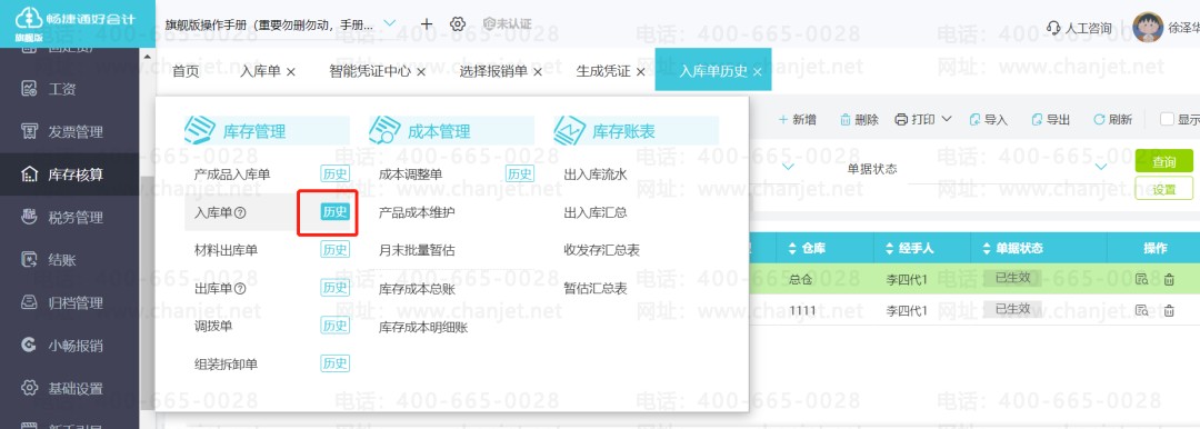 4月6日发票到了之后,点击【库存核算】-【入库单历史】,选择之前录入的【入库单】,查看单据点击右上角复制为【暂估回冲】,进行回冲即可。