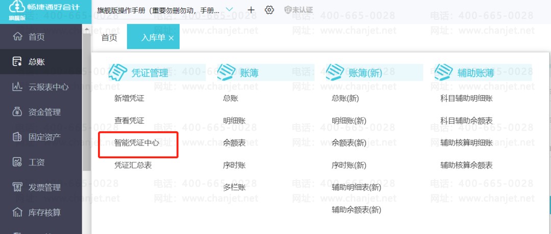 如操作步骤二,点击【总账】-【智能凭证中心】,选择【业务单据】点击【去生成】勾选单据记录生成凭证: