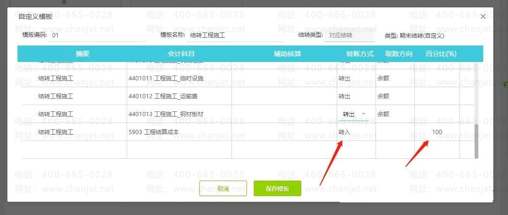 ①“工程施工”下的所有明细科目分别选择,结算方式选择转出,“主营业务成本”或者“工程结算成本”(如下图1),结算方式选择100%转入;