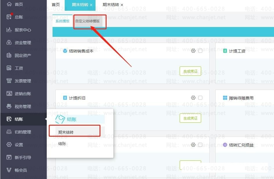 第一步:在【结账】-【期末结转】处,点击自定义结转模板