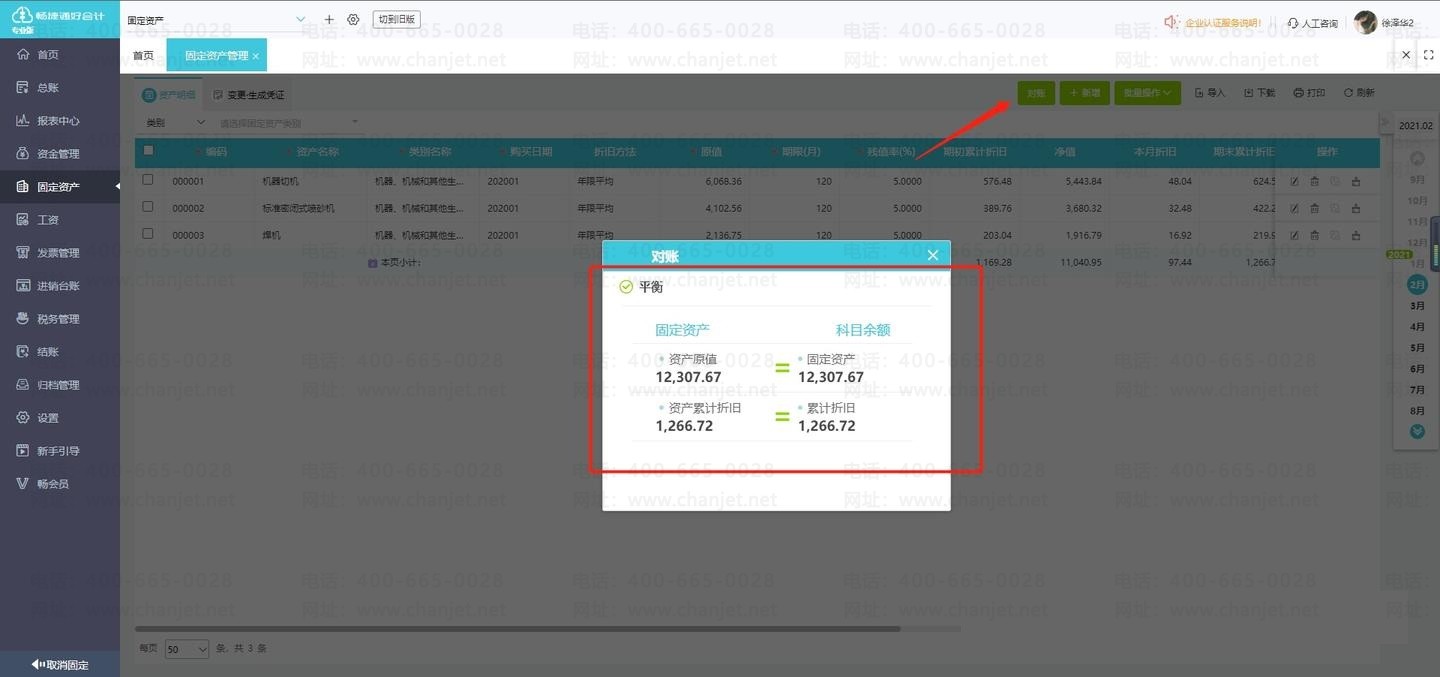 第三步:回到【固定资产】-【固定资产管理】,点击右上角【对账】,当固定资产模块和科目余额各项数据一致,表示模块启用成功。