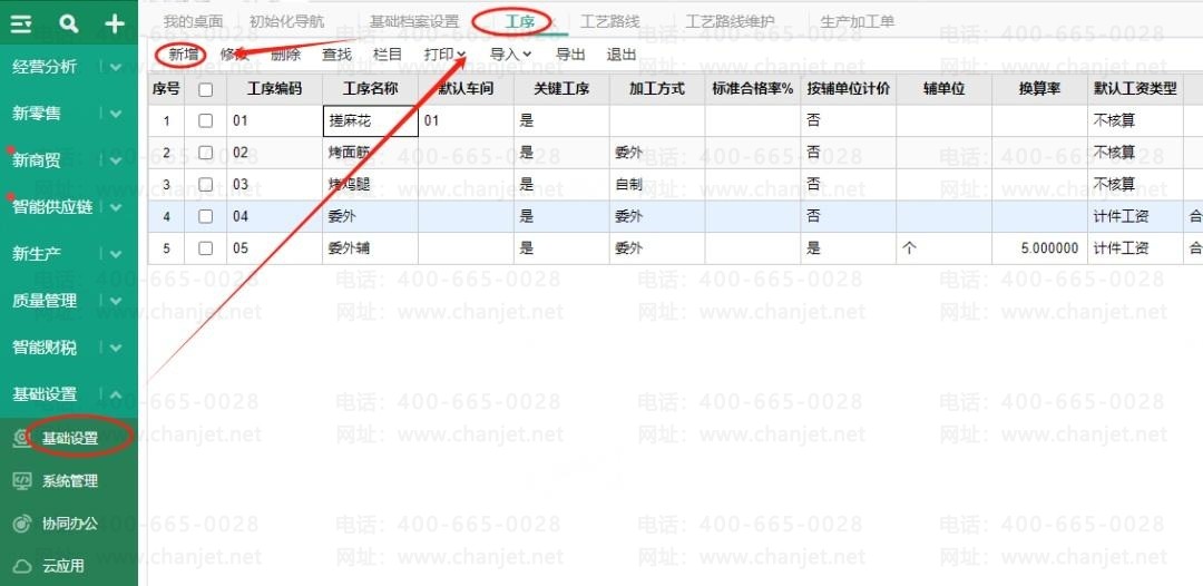 2、基础设置-工艺路线-新增
