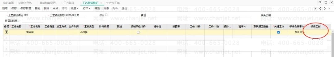 工艺路线内选择之前维护好的工序,可以看到【标准工时】字段为空值
