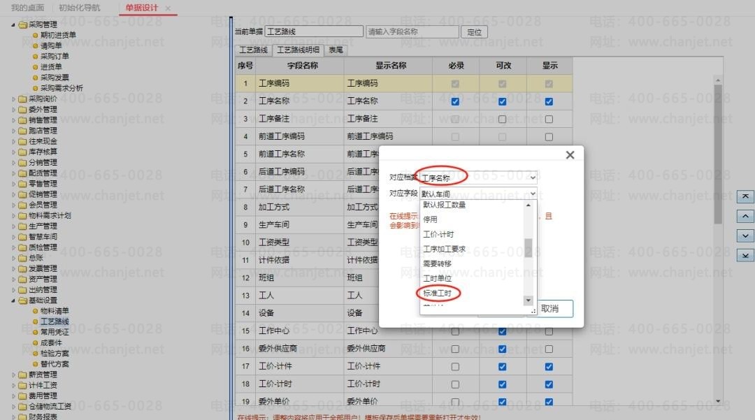 3、系统管理-单据设计-工艺路线-工艺路线明细,引用基础档案属性。