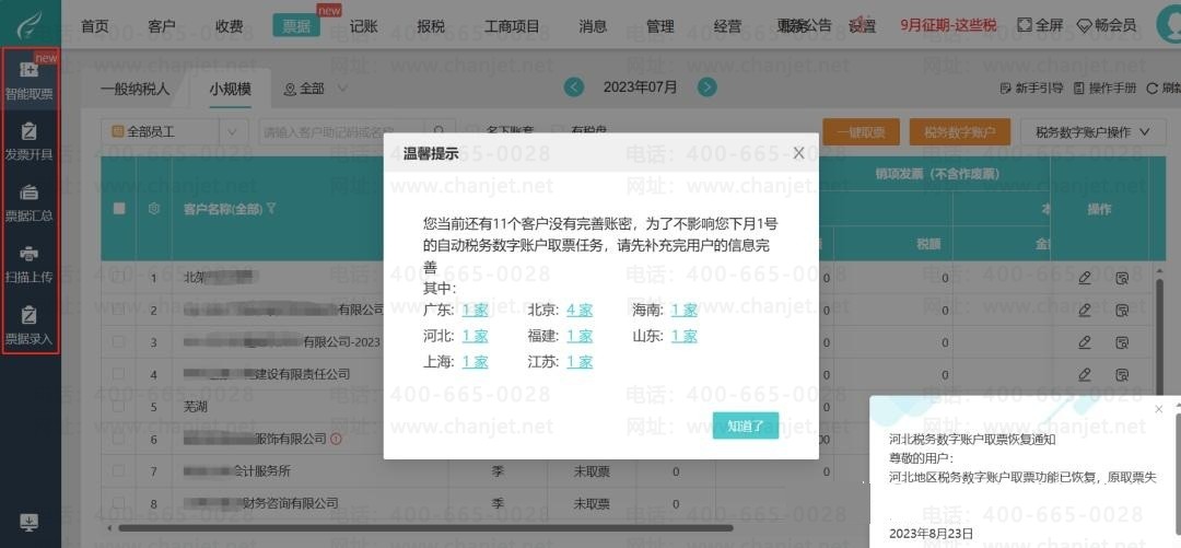 如果您需要查看各家客户公司的发票(包括收到的和开出的发票),您直接一键取票,就可以把发票情况取过来,根据发票可以一键生成凭证;