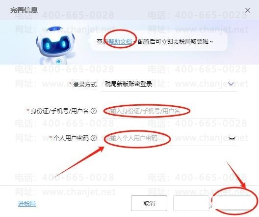 完善信息界面需要输入的是电子税务局的登录账密,如果不清楚需要输入什么节点的账号密码,此界面点击【帮助文档】可以查看各报税地区,具体填写的信息。
