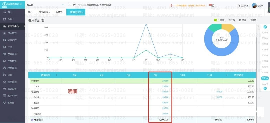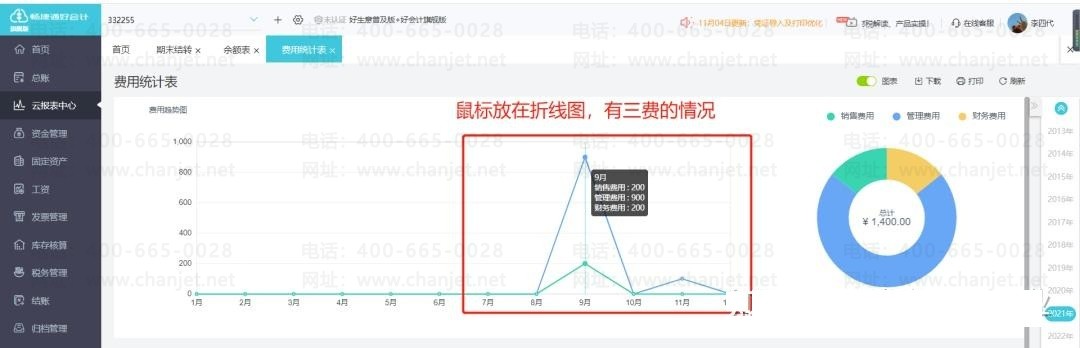 费用统计表的数据是按照余额表取数据,将销售费用、管理费用、财务费用统计在一张表格列示,方便查询