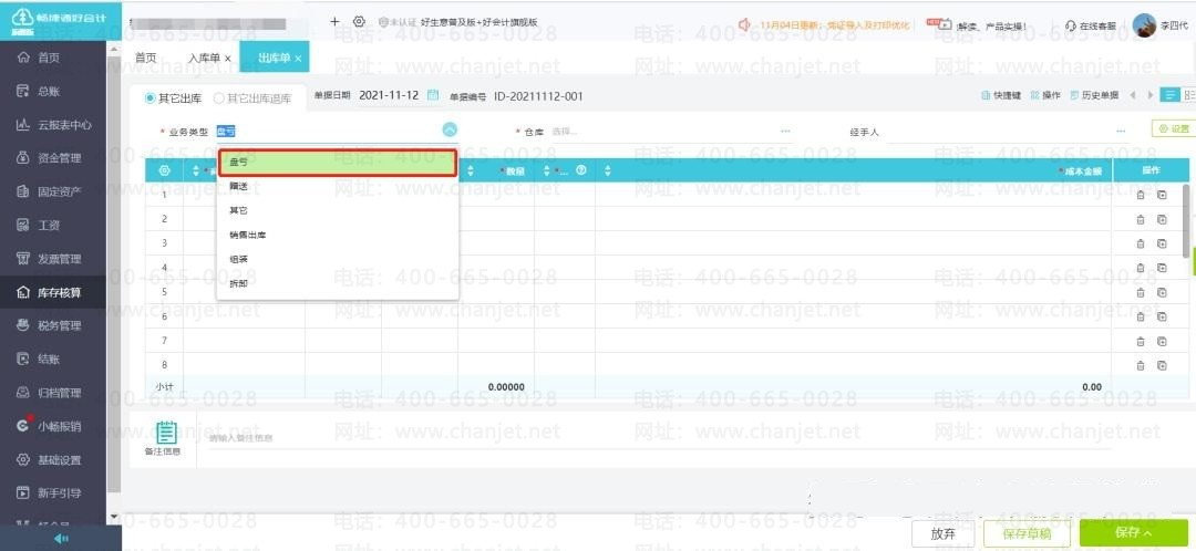 业务类型选择盘亏,把盘亏的商品录入页面,点击保存
