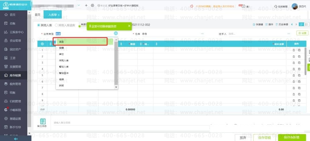 进入入库单,选择业务类型为盘盈,把带*好的填完整,把盘盈的商品录入系统,点击保存