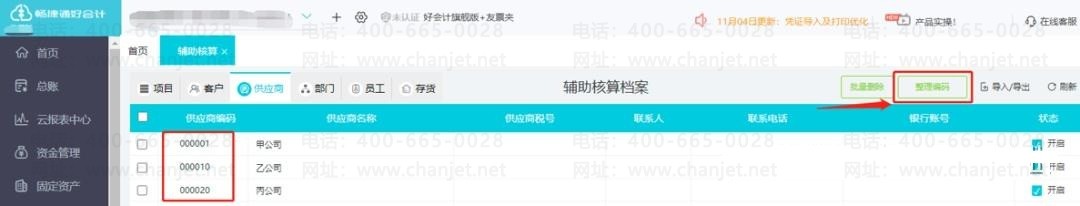 1.以供应商辅助核算档案为例,导入供应商编码没有排序,点击右侧整理编码