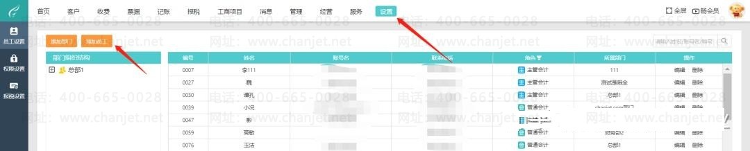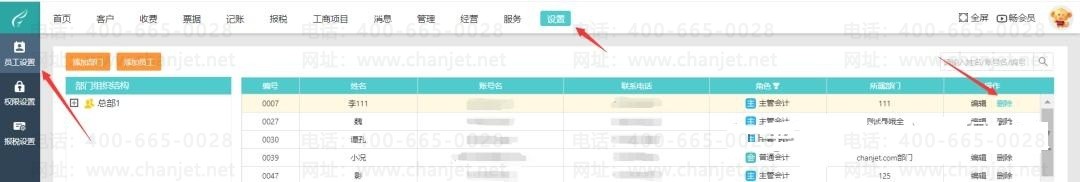 3、删除账号:进入【设置】-【员工设置】,找到离职人员,点击右方【删除】,被删除人员后期不能进入软件。