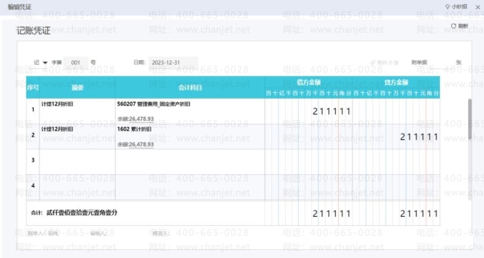 或者在【结账-期末结转】中选中月份,选择计提折旧模板点击【测算金额】生成凭证保存即可。