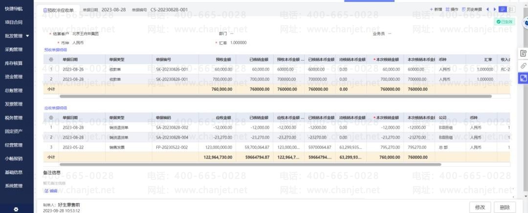 畅捷通好业财可以让你方便地进行收款核销,把它们从账本上划掉,比如预收冲应收,应收核销等。
