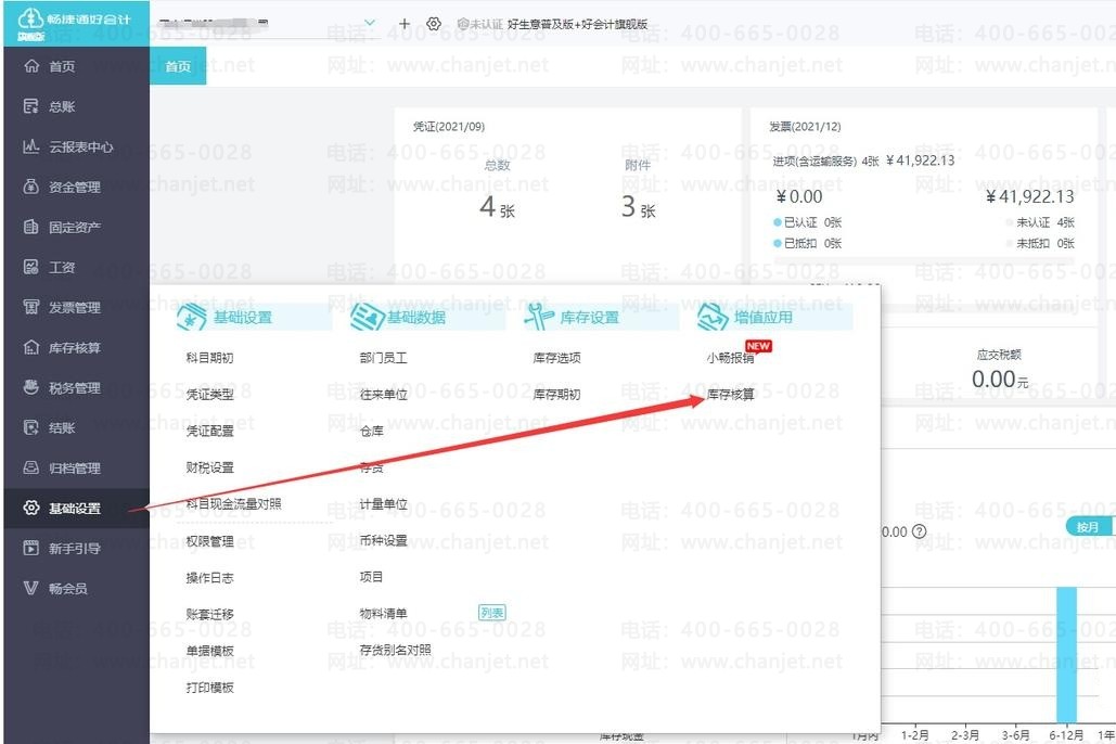 登入好会计旗舰版账号,点击进入相应的账套,点击左边功能栏的【基础设置】-【库存核算】进入,点击启用库存核算,注意库存核算启用时间必须大于财务月结时间.