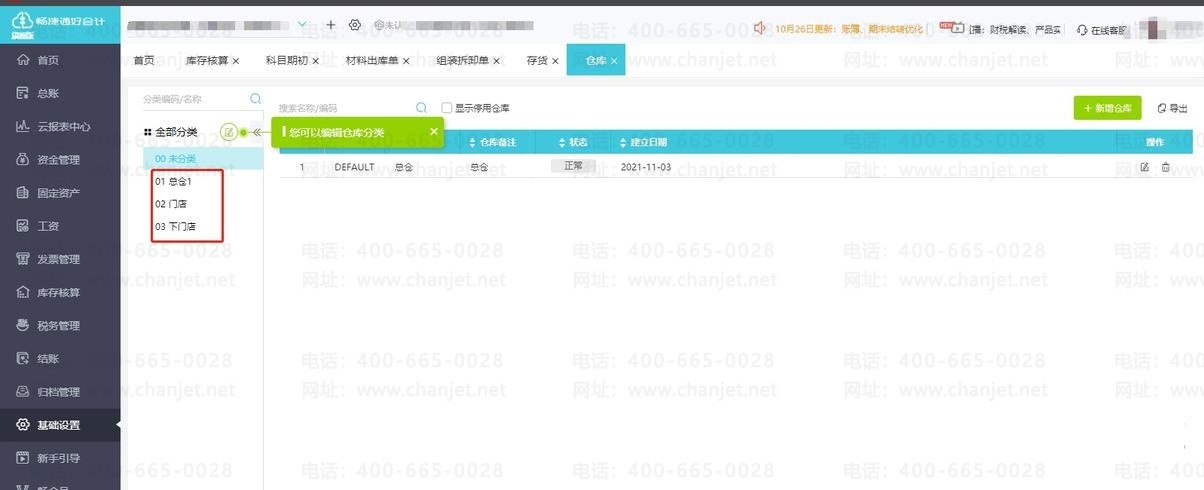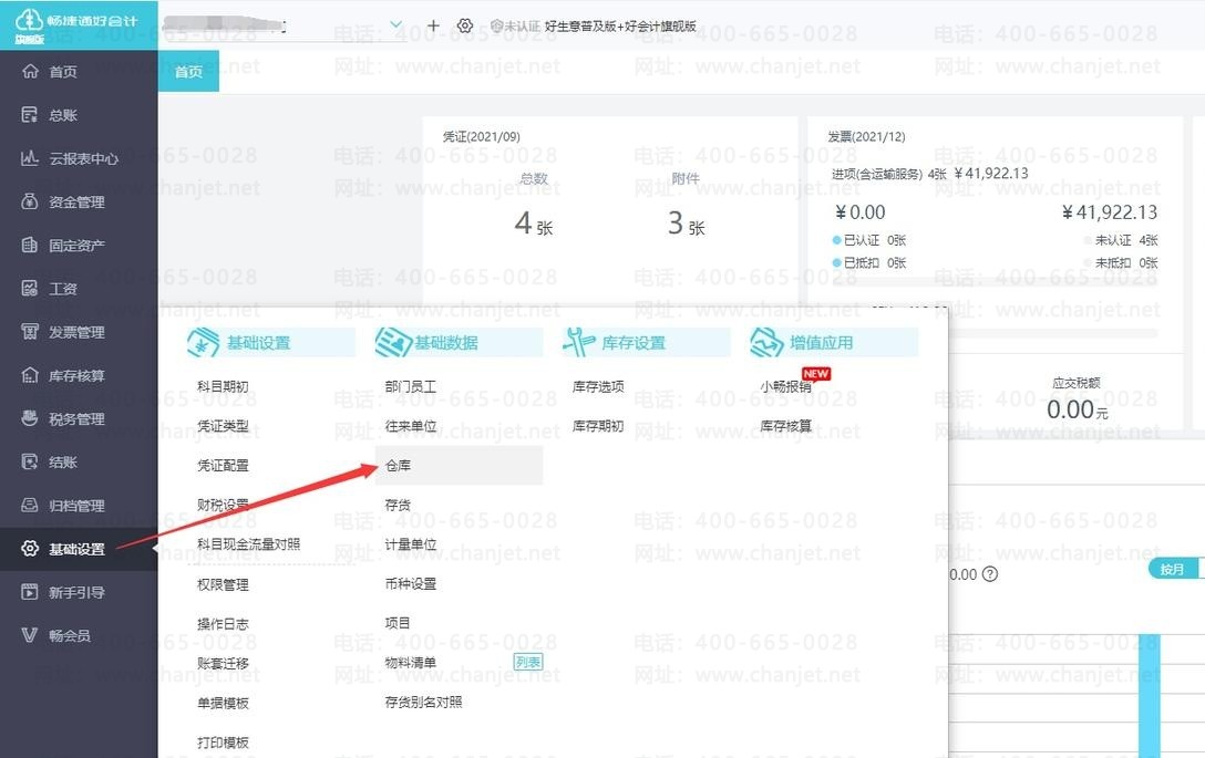 登入好会计旗舰版账号,点击进入相应的账套,点击左边功能栏的【基础设置】-【仓库】进入点击右上方的【新增仓库】添加相应的仓库信息即可
