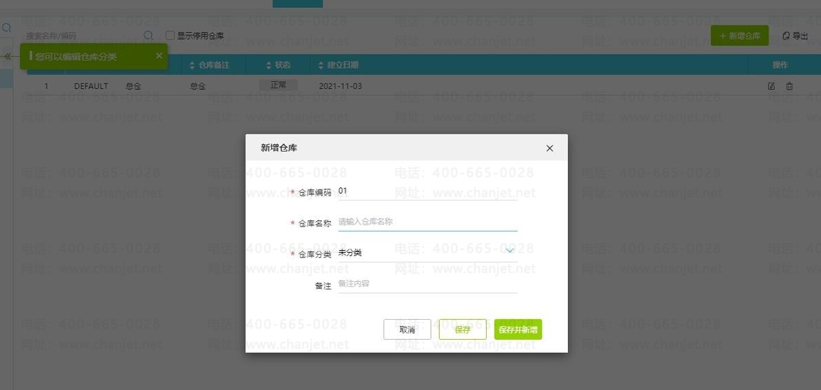 2.维护好仓库档案:【设置】-【仓库】添加总仓与门店仓