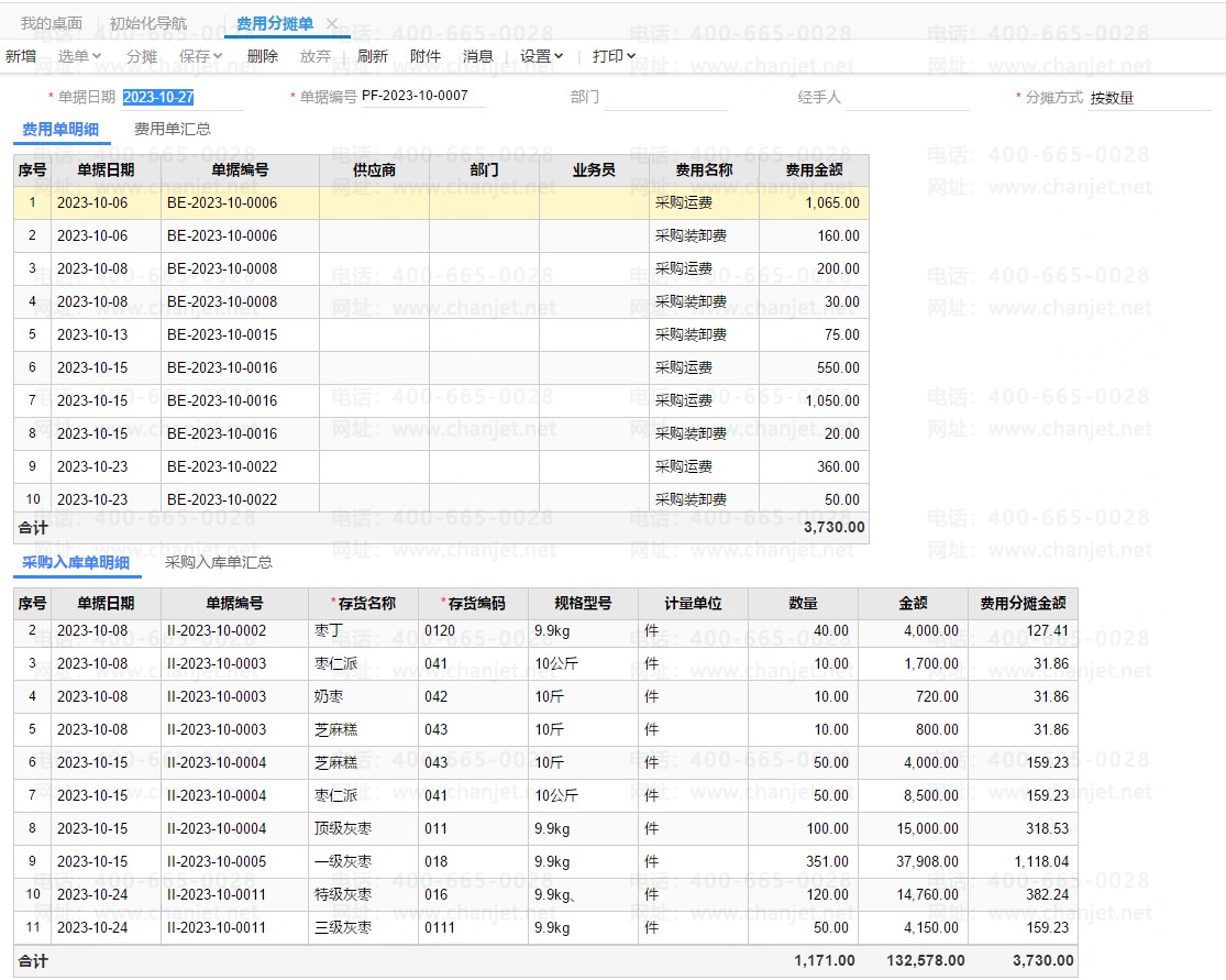 如果是费用分摊选择对应的订单,费用也会分摊进去。