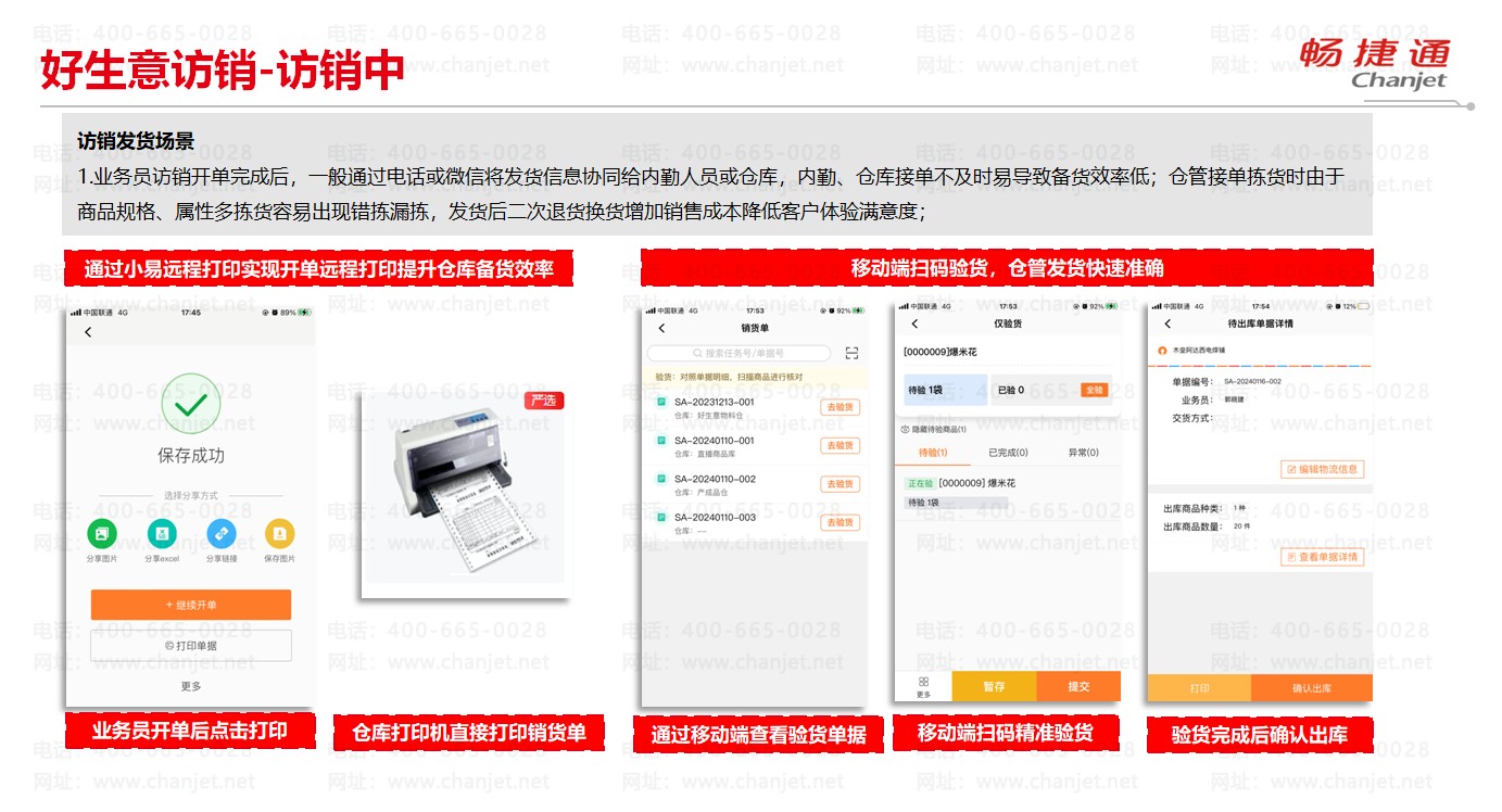 1.业务员访销开单完成后,一般通过电话或微信将发货信息协同给内勤人员或仓库,内勤、仓库接单不及时易导致备货效率低;仓管接单拣货时由于商品规格、属性多拣货容易出现错拣漏拣,发货后二次退货换货增加销售成本降低客户体验满意度;