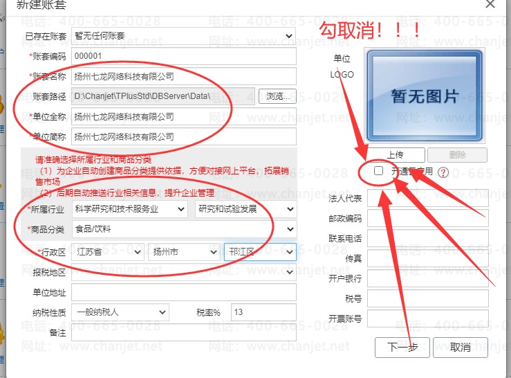 这里账套名称就是单位名称,下面的填写一样的即可。这个界面型号必须填写的,所属行业和商品分类,地区等等都随意填写就可以了,不一定填写真实的。