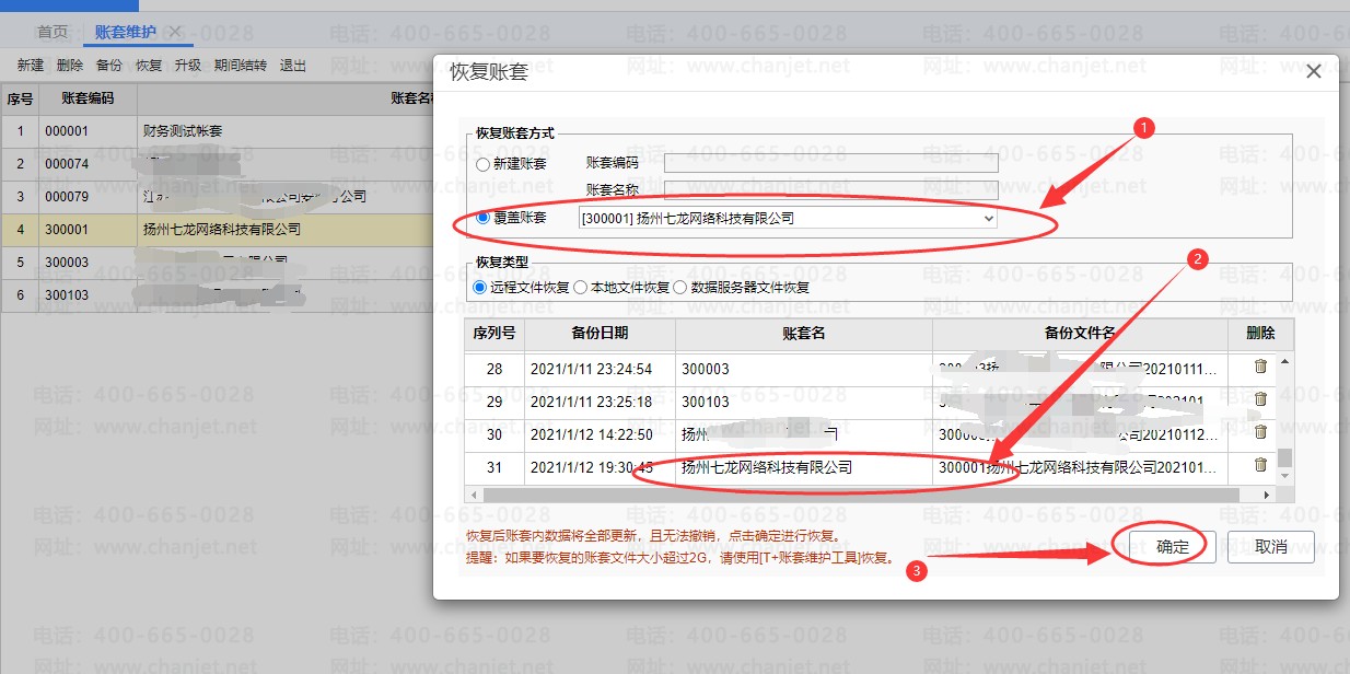 账套恢复和备份一样,从账套维护里面,点上面的恢复,然后选择需要覆盖的账套,下面选备份文件来自哪儿?如果是其他地方拷贝过来的备份,那就可以选择本地,或者服务器上的文件,如果是本机之前备份的,那就默认第一个,然后下面选中,然后点确定,即可自动回复数据。