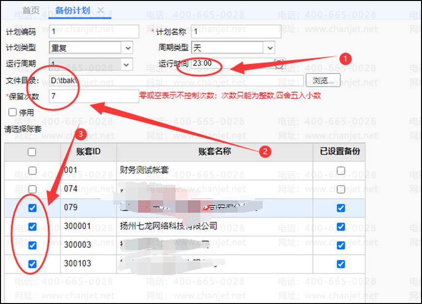 备份计划的名称和编号任意,主要是运行周期,是每天备份还是一个星期备份一次,建议每天备份,然后是几点备份,正常服务器24小时开机的话,就是半夜没人用的时候备份,保留的天数,意思是保留几个节点的,如果是7天,那每天都会备份,然后删除7天之前的备份,当然备份出来的每天的数据都包含以前所有的数据。下面是勾选哪些账套需要备份,并设置备份在服务器上的路径。