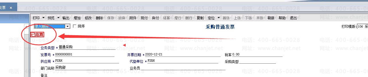 第三部,录入采购发票,进行结算,发票金额写一个,然后保存点结算。然后再去应付单审核里面将这张发票审核掉。审核之后单据左上角就提示已经审核并结算,看下面第三幅图片。