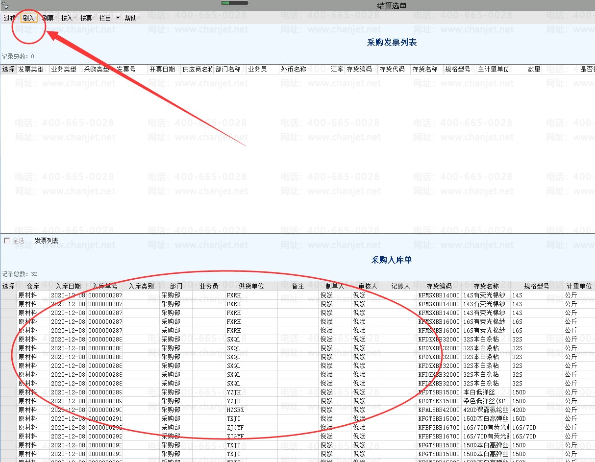 过滤点完确定之后,点上面的“刷入”下面采购入库单就出来了,然后点刷票,发票就出来了