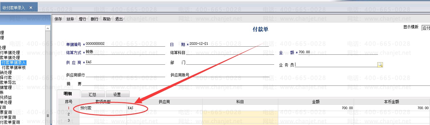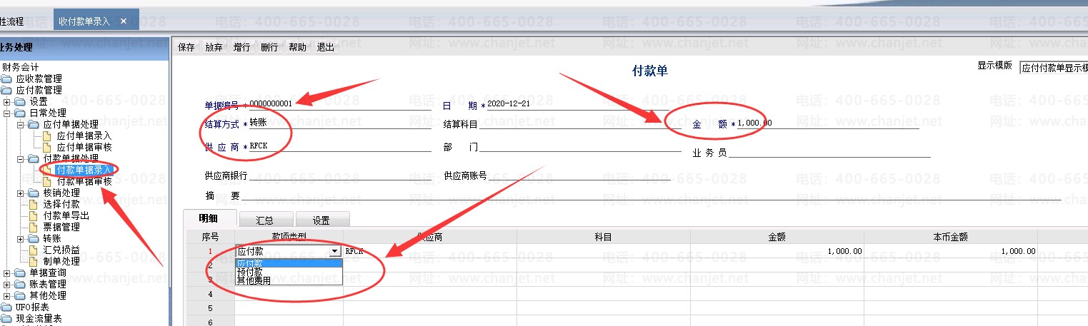 上面的步骤是立正式的应付账款,下面给供应商付款,点付款单,然后点增加,依次录入付款单的内容信息,最后保存,这个就是一张付款单。