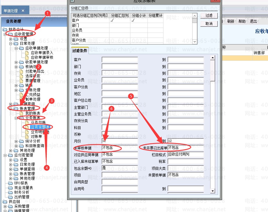查询一下应收账款的余额表看看,具体位置是财务会计----应收款管理----账表管理----业务账表---业务余额表,当然查询的报表很多,我只是举例一个。箭头5和6处指示,意思是你查询的这个往来账,是否包含发货了,但是没有开票的,还有没有审核的单据。如果你想看所有发货的应收账款,不管是否开票,那这里两个地方你选包含,否则就是不包含。