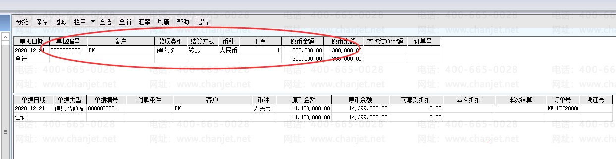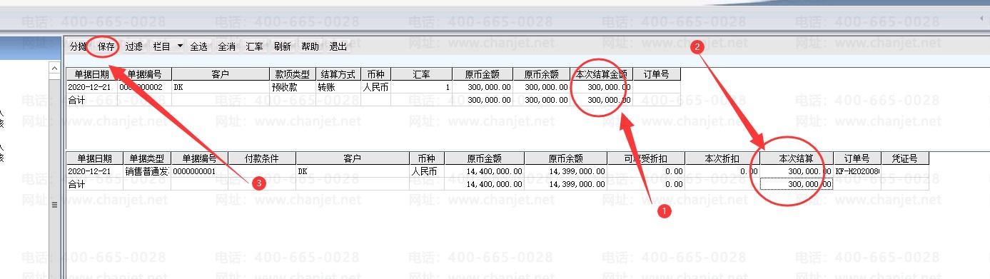 预收款一样需要核销,跟刚才选择的步骤一样,点开。过滤之后,上面显示刚才我们录入的预收款。然后上下都写一样的金额保存即可核销。