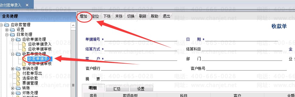 点开增加一张收款,输入详细的收款信息,包括收款金额,下面选择是收的应收款,然后保存。
