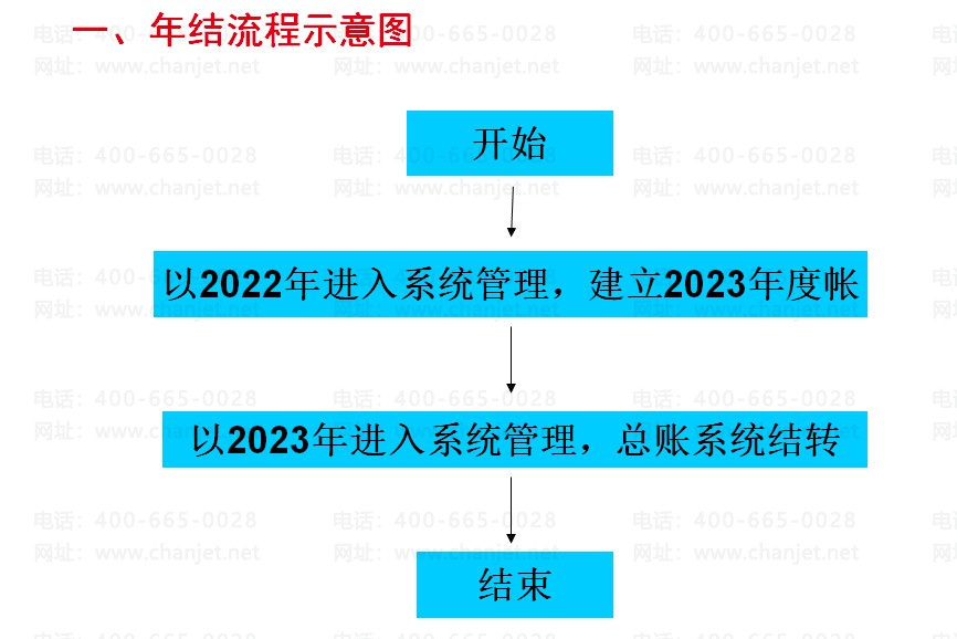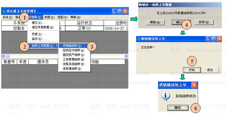 以账套主管进入系统管理→年度帐→结转上年数据→供销链结转→确定→开始→确定 系统结转成功(如果没有这些模块,只有总账模块,可以直接点总账系统结转,其他跳过)