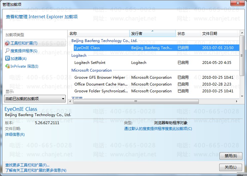 点击IE浏览器的“工具“ –” Internet选项“ –“程序“- “管理加载项” –“工具栏和扩展”,右击不需要的加载项然后点击“禁用”。