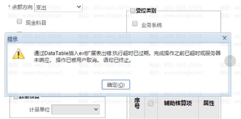 畅捷通T+科目提示 通过DataTable插入ext扩展表出错:执行超时已过期。完成操作之前已超时或服务器未响应。操作已被用户取消。语句已终止。