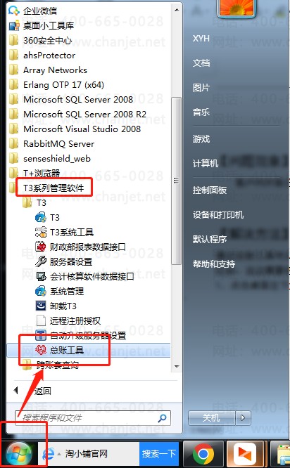 1、点击桌面左下角的开始-所有程序,找到T3企业管理软件文件夹展开,找到总账工具