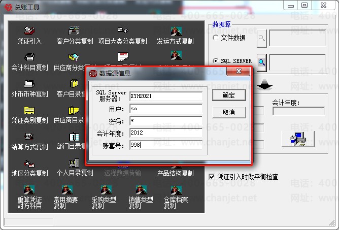 3、服务器和用户默认带出的不用修改,密码需要输入数据库的密码,选择要被复制的账套和年度,比如我这边是从998账套复制凭证到111账套,那这里就选择998账套,之后点击确定