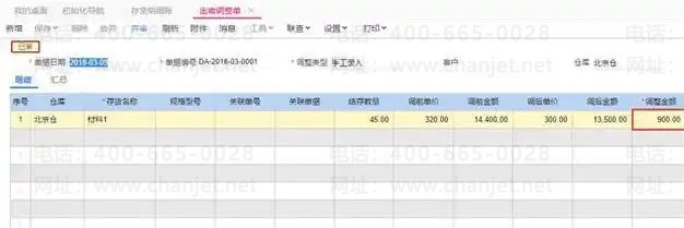 3.如果想调整为300元一个,那么填制“出库调整单”,调整金额900=14400-45*300: