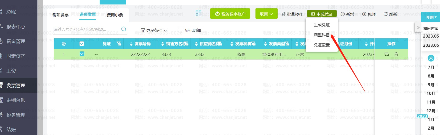 然后勾选进项发票,点击生成凭证-调整凭证,进行修改一下进项发票中的存货名称