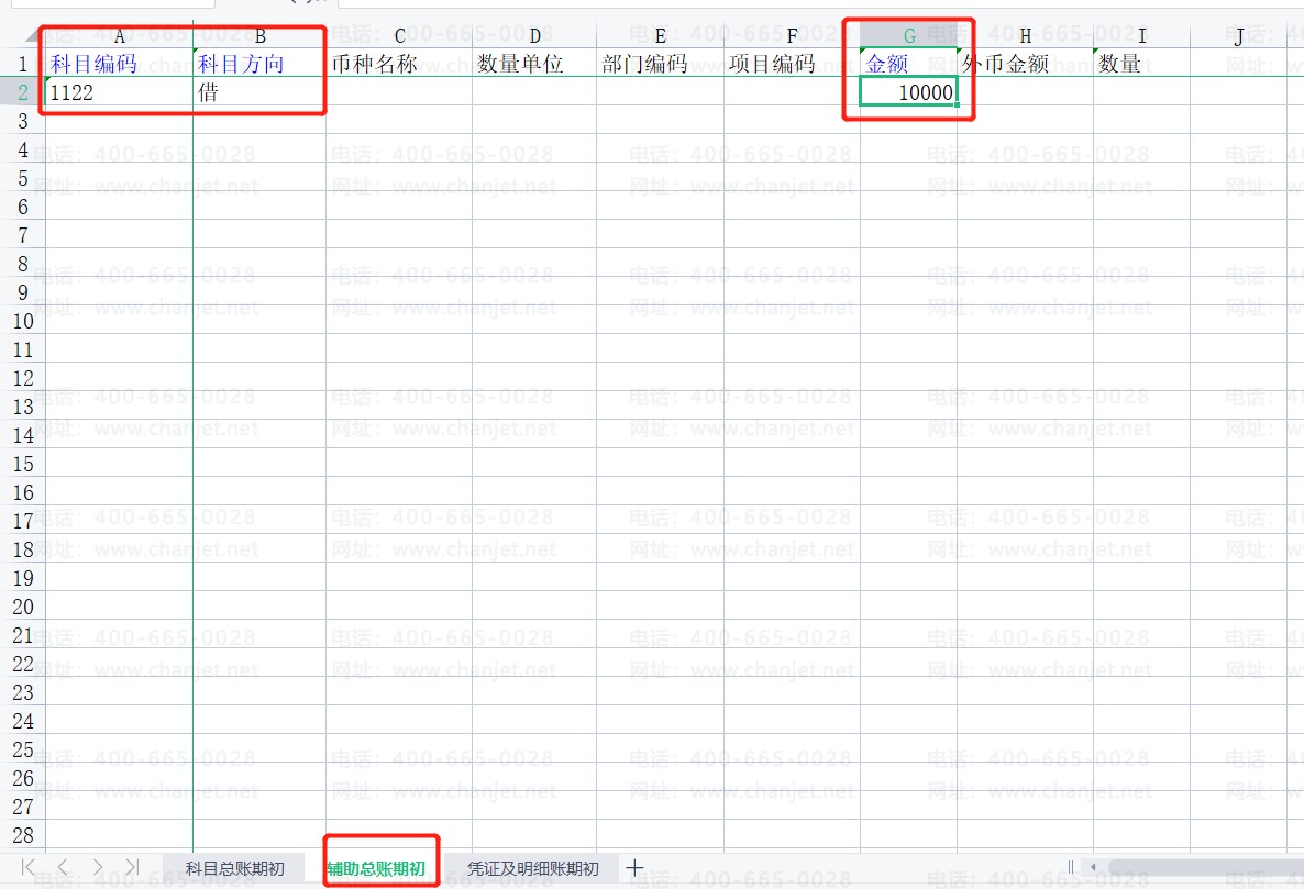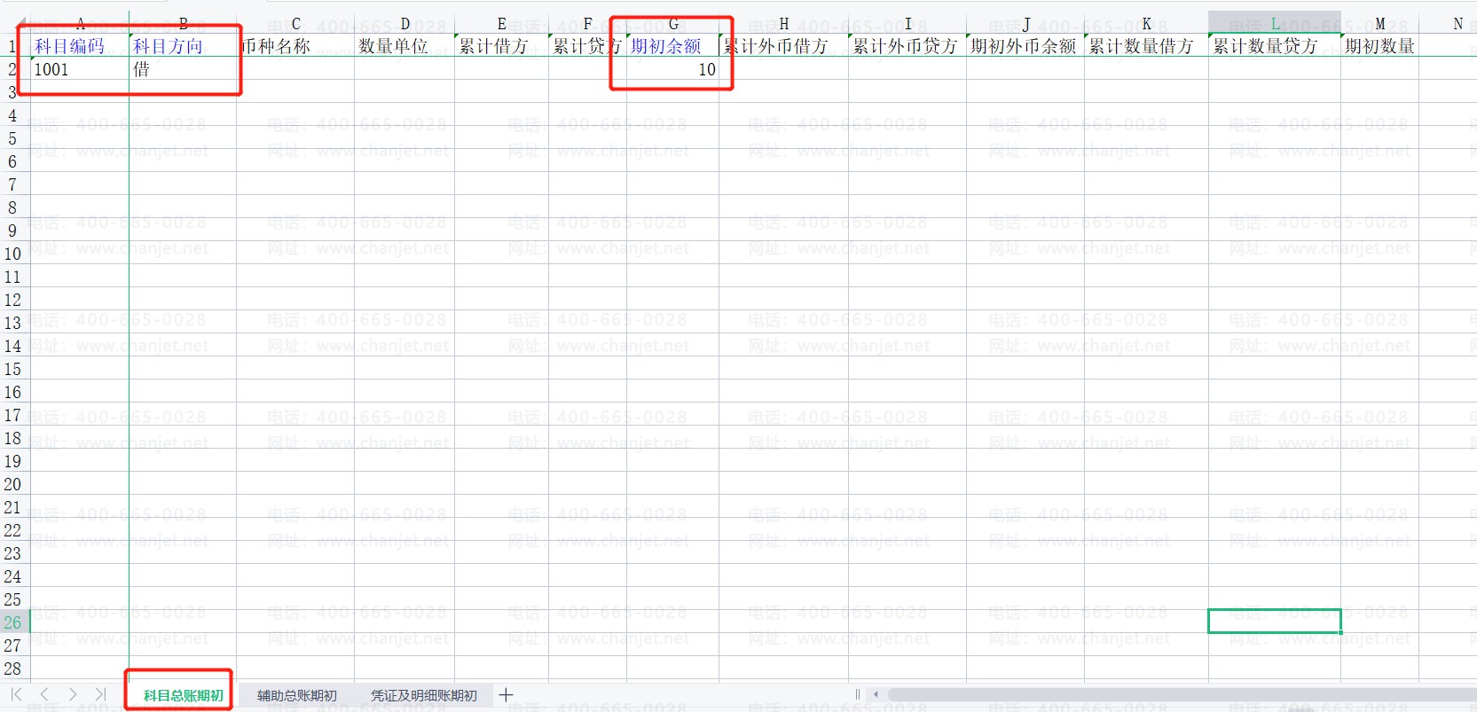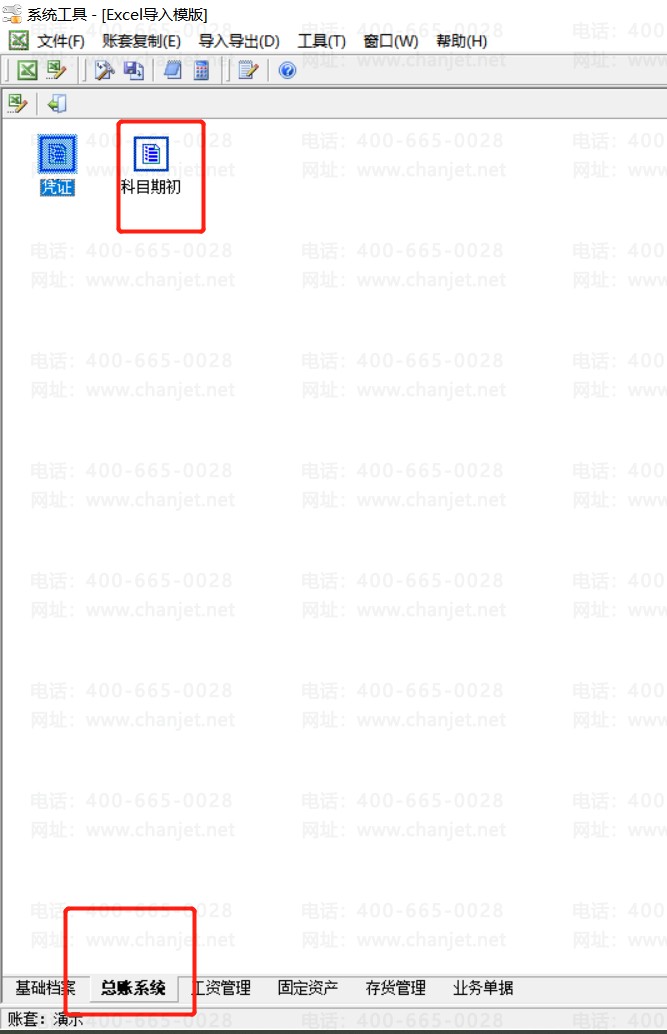 3、点击Excel模板,选择总账系统-期初余额将数据录入至模板中