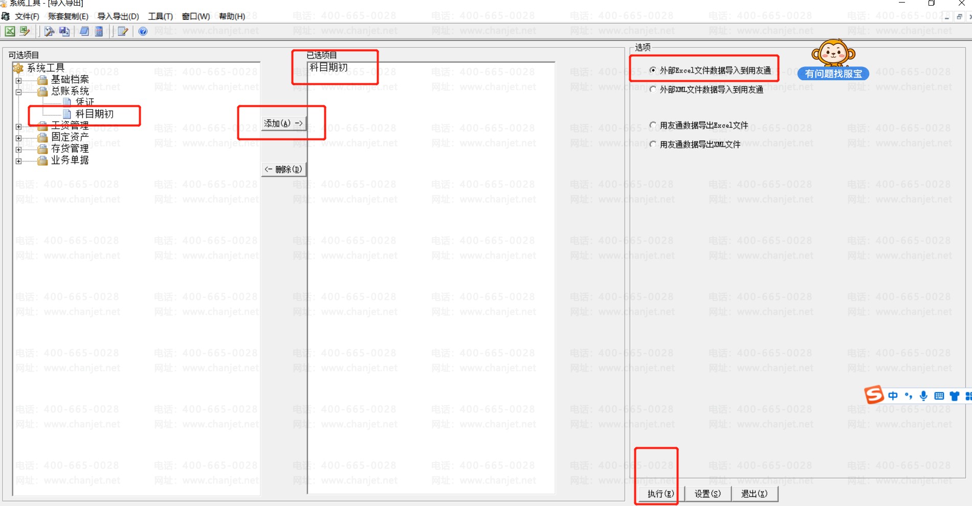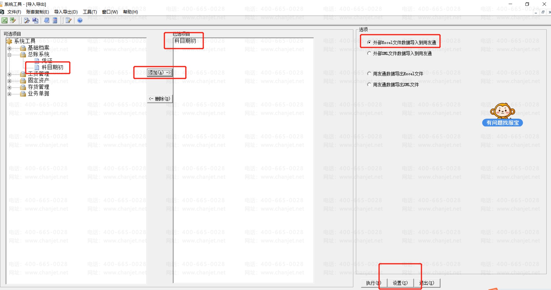 6、将需要导入的项目指定至已选科目后选择外部Excel数据导入到用友通,点击设置选择上一步中保存的表格路径