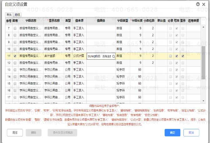 首先更改名称将系统自带的【单据编号】更改为【合同编号】,下一步去【自定义项设置】增加一个数值类型的专用自定义项,名称更改为客户需要的【合计金额】利用公式计算器计算出正确的金额。保存查看单据是否变化。