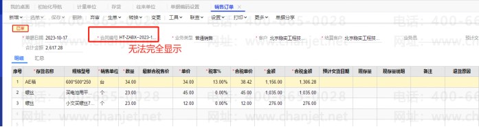 单据设置成功,但是由于合同编号长度过长,此时需要用到【调整控件宽度】